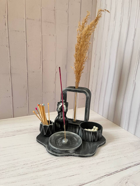 ست شش تکه پتینه شامل سینی، جا شمعی، جا کبریتی، جا عودی، گلدان، مجسمه